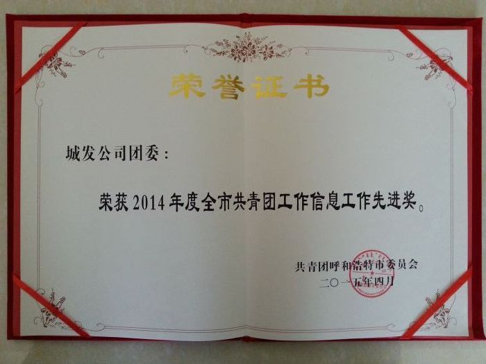 ,在共青團呼和浩特市十六屆二次全委(擴大)會暨少工委五屆五次全委(擴大)會議上,城發公司團委榮獲“2014年度全市共青團工作信息工作先進獎”。