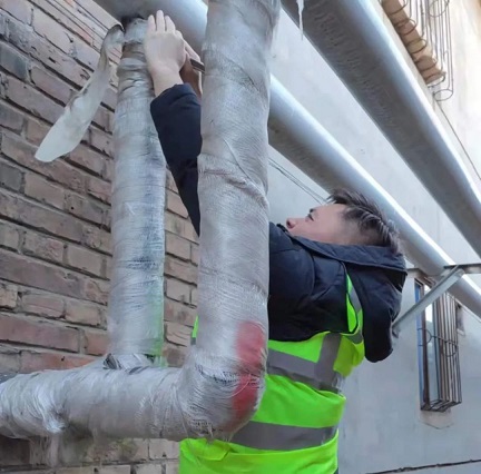 "咱們先把這段管網(wǎng)的巖棉扒了,都戴上手套,別扎著"初二中午12點(diǎn),筆者在云鼎所車站西街華聯(lián)超市倉庫內(nèi)看到新華西分公司檢修所李明和工作人員正在查找跑水點(diǎn),他說:"11:30接到電話反映這里二次管網(wǎng)跑水,我就趕緊帶著工作人員過來了,由于這個(gè)管網(wǎng)的保溫是巖棉,很扎人,我們處理的時(shí)候得小心一些。"沒過一會(huì)兒他們就在DN80二次管網(wǎng)上找到了跑水點(diǎn),為了不影響正常供熱,李明決定帶水帶壓用打卡子的方式封堵漏點(diǎn),經(jīng)過半個(gè)多小時(shí)的作業(yè),搶修完成。李明告訴筆者:"春節(jié)對(duì)于我們來說和平時(shí)一樣,我來富泰熱力工作了20年了,年年如此,也希望和家里人一起過個(gè)春節(jié),可是我們要是休息了,用戶家里用熱方面有什么事兒怎么辦,工作性質(zhì)就是這樣,既然選擇了這份工作,我就得把它做好。"