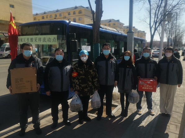 在核酸檢測現(xiàn)場,大家還看望了下沉到該社區(qū)擔當防疫志愿者的物業(yè)公司黨支部書記娜仁同志,此刻的她正身穿防護服全神貫注地為排隊等候的居民逐一掃描、錄入身份證件信息。在中間休息的片刻時間,娜仁同志為大家簡單介紹了此處疫情防控的最新情況、防控要求及工作人員的配備、交接班制度及用餐作息等情況。她深有感觸地說:"社區(qū)的工作人員、志愿者們每天都很辛苦,厚重且不透氣的防護服一穿就是七個多小時,中間不吃不喝,更不能上廁所,但大家都憑著堅強的毅力堅持了下來。每當脫下厚重的防護服,大家都感覺渾身像散了架一樣,只想著立刻吃上一口熱乎飯,躺下來好好睡一覺。在這樣的持續(xù)堅守下,大家卻毫無怨言,因為她們知道自己肩負的責任和使命是多么光榮和神圣。"她鼓勵前來慰問的同志們,在此次抗擊疫情的非常時期,公司全體黨員要充分發(fā)揮好一個黨員就是一面旗幟的作用,在做好本職工作的同時,積極參加到社區(qū)疫情防控的隊伍中,去做些力所能及的事,為社區(qū)筑牢織密疫情防線貢獻力量!