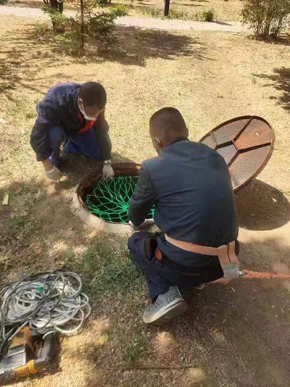 安裝現場,工作人員打開井蓋通風,在用氣體檢測儀檢測井內的氣體符合作業條件后,工作人員綁好安全帶用電鉆在井壁上鉆孔,釘入尾端帶鉤的膨脹螺栓,擰緊固定后將防墜網掛到掛鉤上,一張防墜網就安裝完成?,F場工程師傅每完成一個防墜網的安裝,在確保安全的情況下,都會親身踩試檢驗,確保安裝牢固。