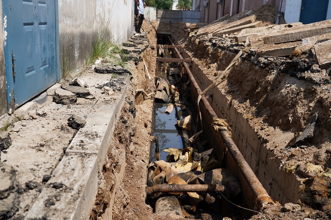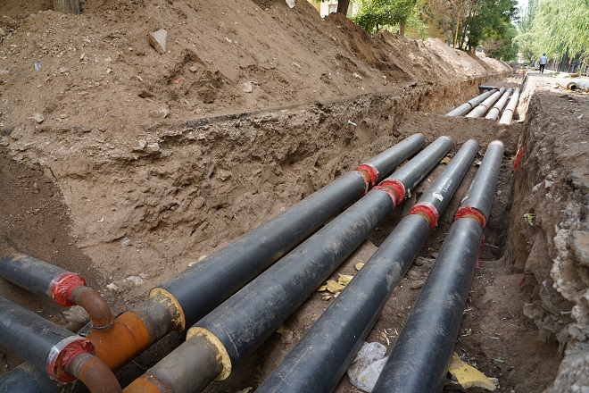 在開天花園小區熱力站供熱管線出口區域,兩名工人師傅正在清理現場的供熱管線。現場看到管溝內鋪設的主管線、與樓宇的抽頭安裝已全部完工,溝內自來水管線、污水管線、弱電管線、強電管線縱橫交錯。
