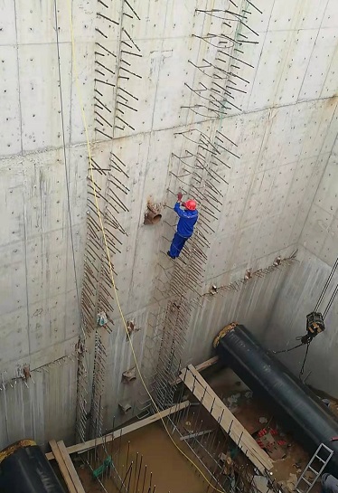 7月28日上午,遠遠就看到一名施工人員正沿著沉井壁上的幾根鋼筋小心翼翼地下到沉井底部,筆者看的是膽戰心驚,沉井底部有兩名焊工正在焊接管線接口。